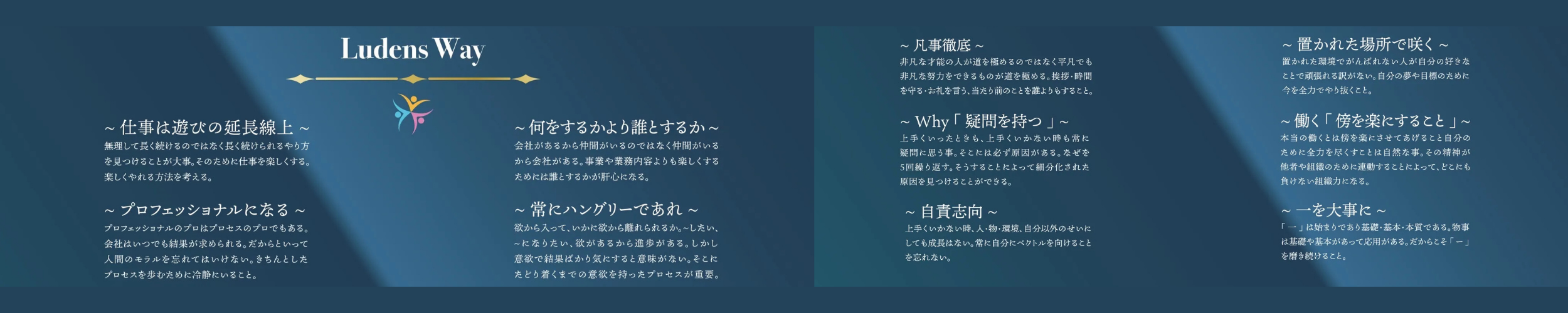 Ludensとは20世紀の偉大な歴史家 ホイジンガの言葉でラテン語で【遊び】を意味します。 人は遊びの中で成長し学んで進化している。 そしてその遊びの中から文化(競技、法律、音楽、戦争、詩、哲学、芸術)ができたとも言われています。 だからこそ”仕事”という遊びの中で成長し、人々を豊かにすることを目標に、従業員が挑戦して輝ける場所であり続け、関わる人全てに輝く笑顔を作り続けます。